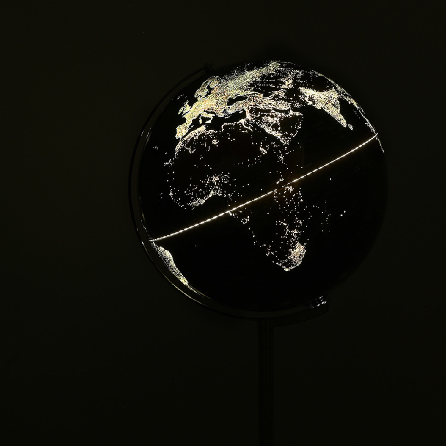 - integrierte Beleuchtung mit hell beleuchteten Metropolen, verchromter Metallfuß, Gesamthöhe 1,32m, Kartenrelief, bewegliche Achse, inklusive Ladestecker mit GaN - und Schnellladetechnologie Power Delivery, 20W mit USB-C und USB-A Anschluss