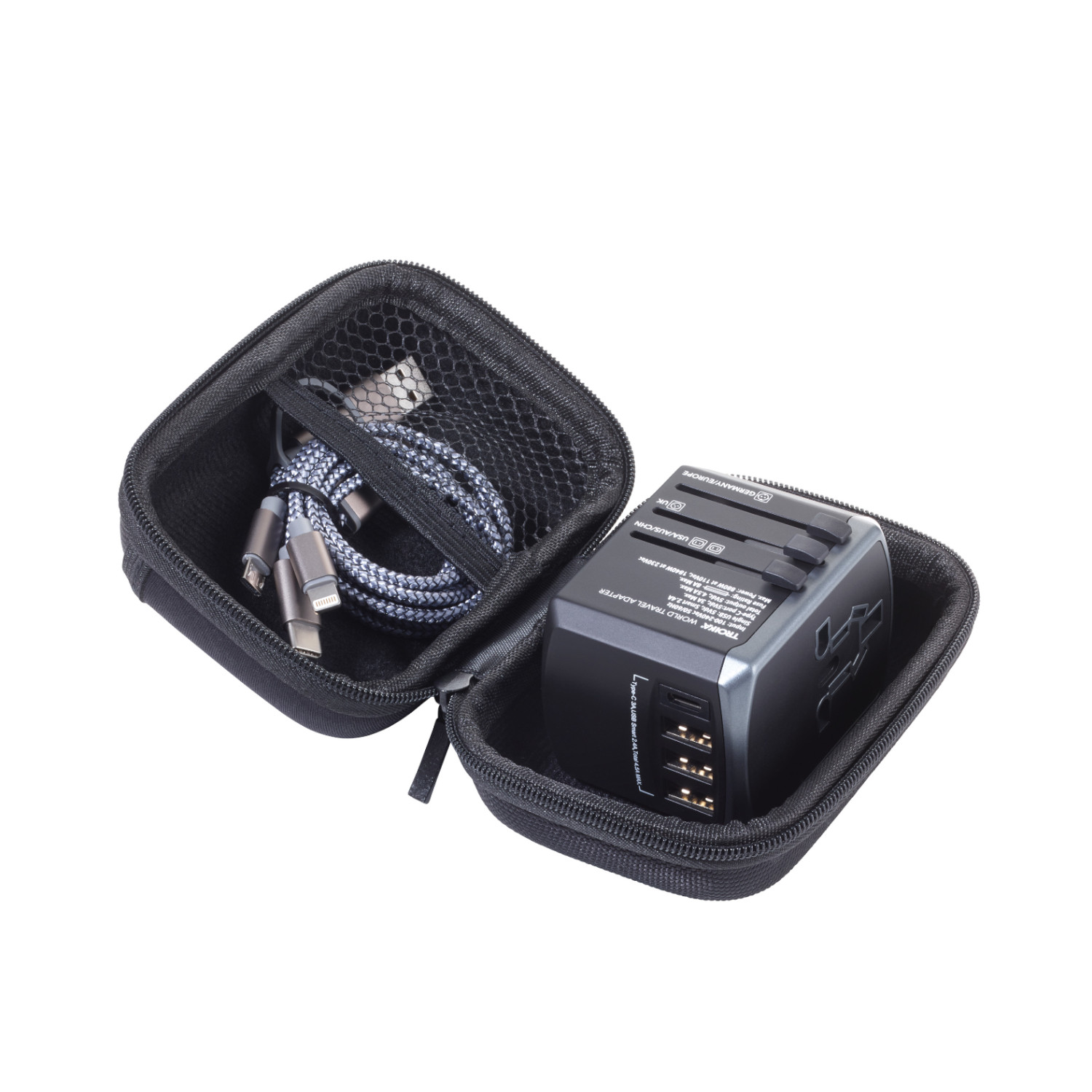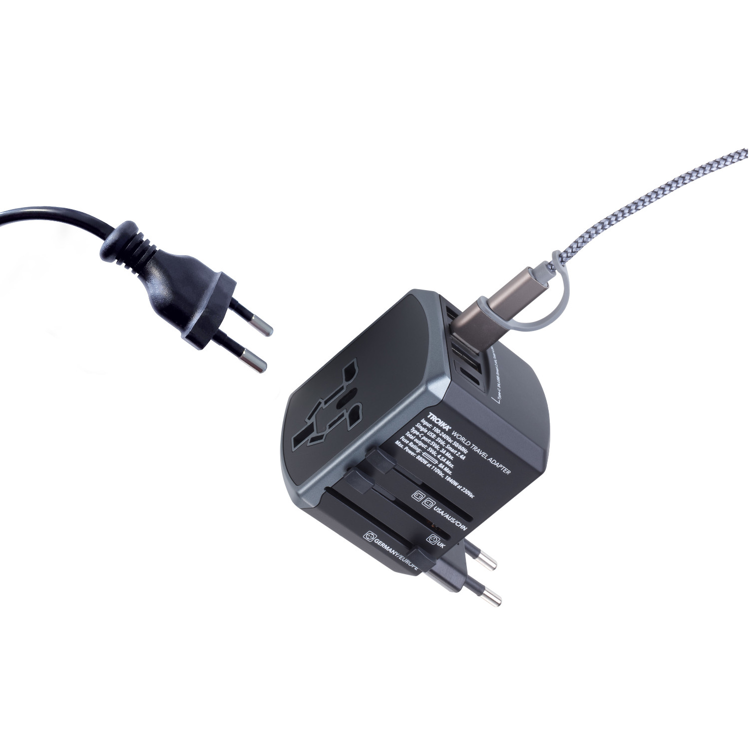 Mit 2,4 A Ladespannung am USB-C- und 3 A am USB-Anschluss. Absolut flexibel und extra safe mit eingebauter 8-Ampere-Sicherung inkl. Ersatzsicherung. Der TROIKA WORLD TRAVEL ADAPTER kommt in der praktischen Aufbewahrungsbox mit hochwertigem 3-in-1-Ladekabel.