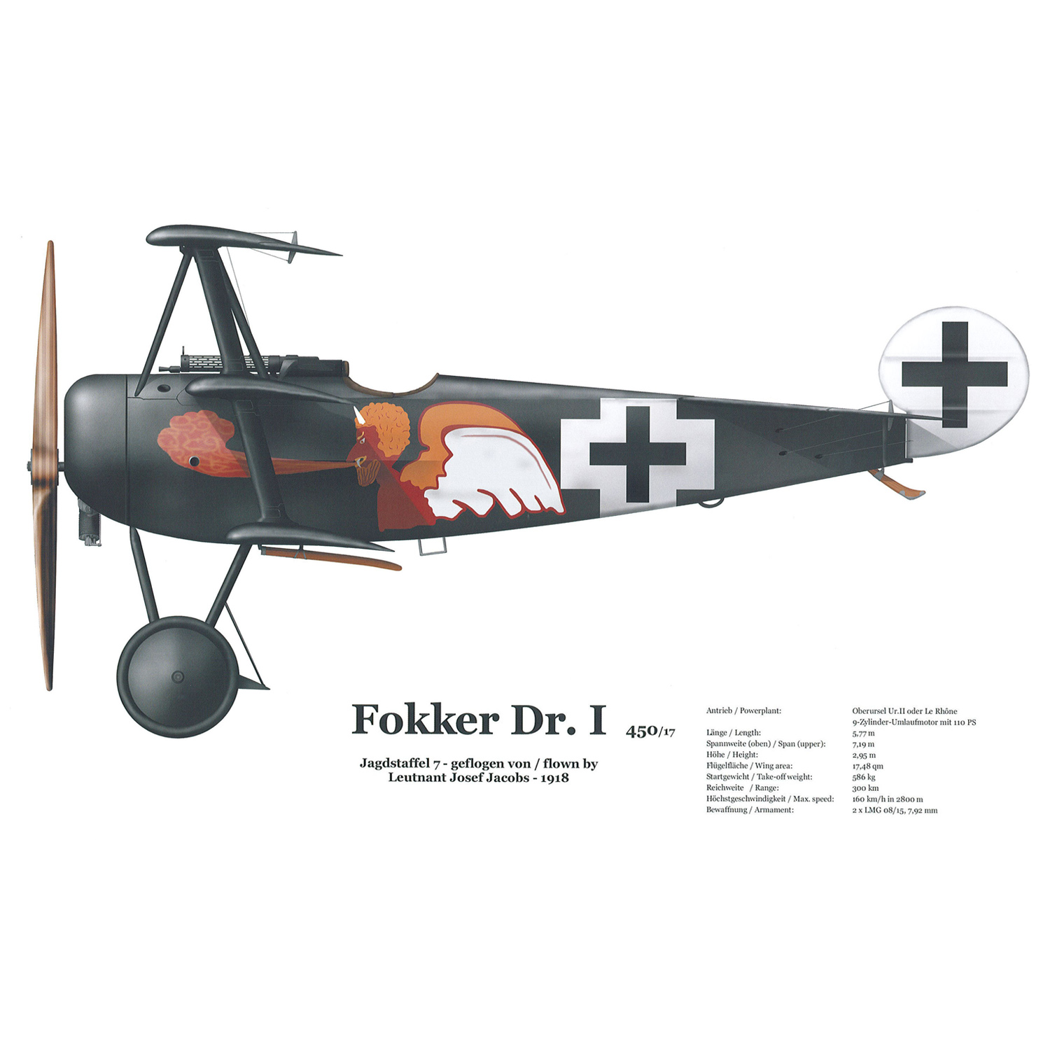 Der Dreidecker Fokker Dr. I ist das bekannteste Jagdflugzeug des 1. Weltkrieges. Es war sehr wendig und deshalb für den Luftkampf besonders geeignet. Als Bewaffnung dienten zwei Maschinengewehre, die durch den Propellerkreis schießen konnten.