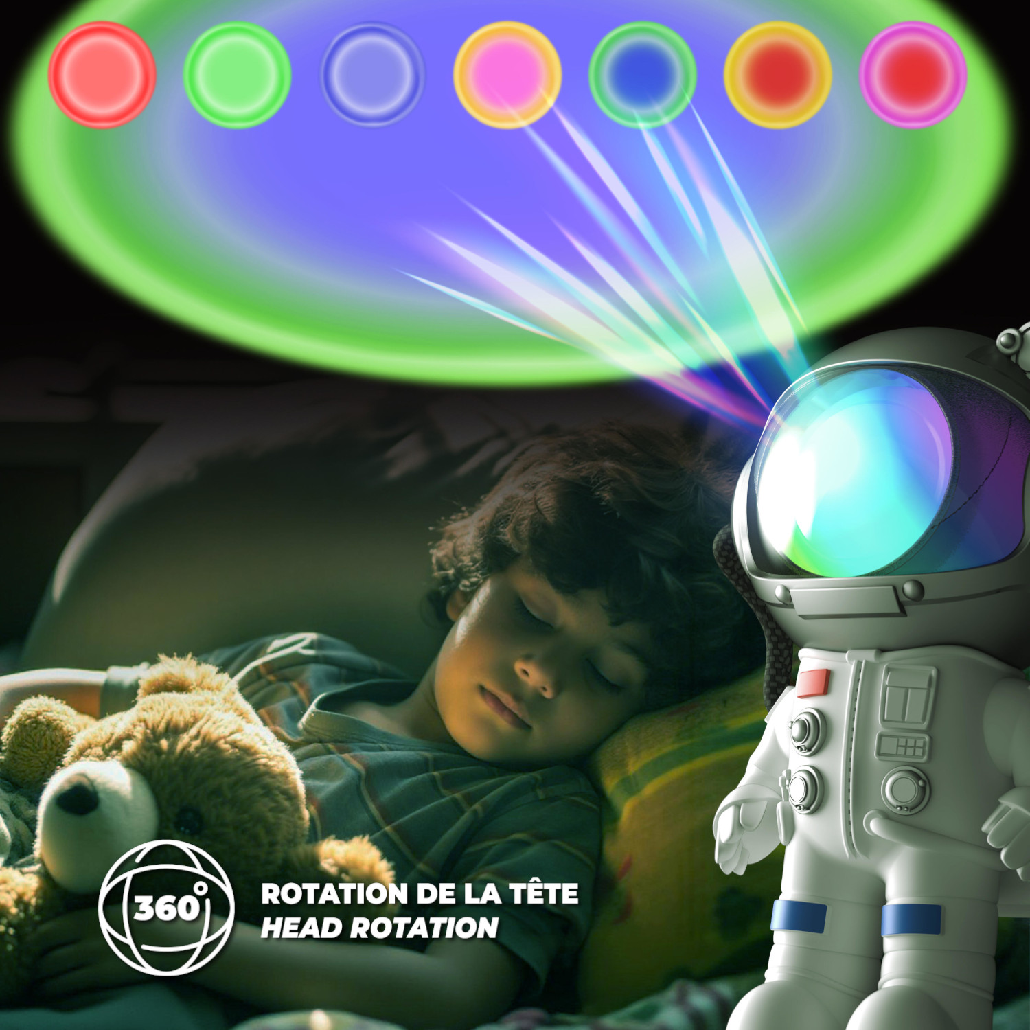 Es projiziert sieben verschiedene Weltraum-inspirierte Lichtbilder wie Nordlichter, Sonnenuntergang oder Nebel. Zudem sind entspannende Klänge und weißes Rauschen integriert – etwa Regen, Wellen oder Waldgeräusche.