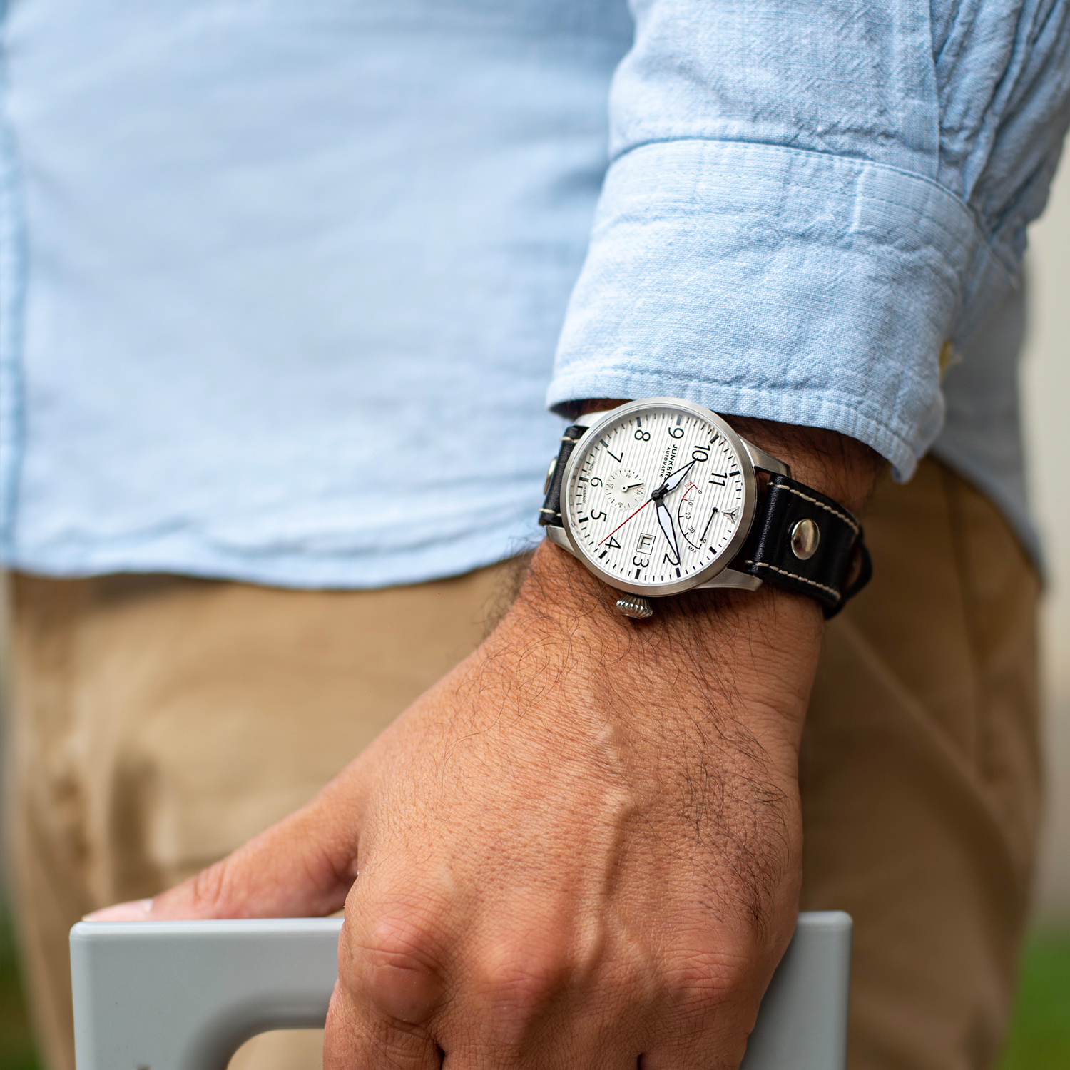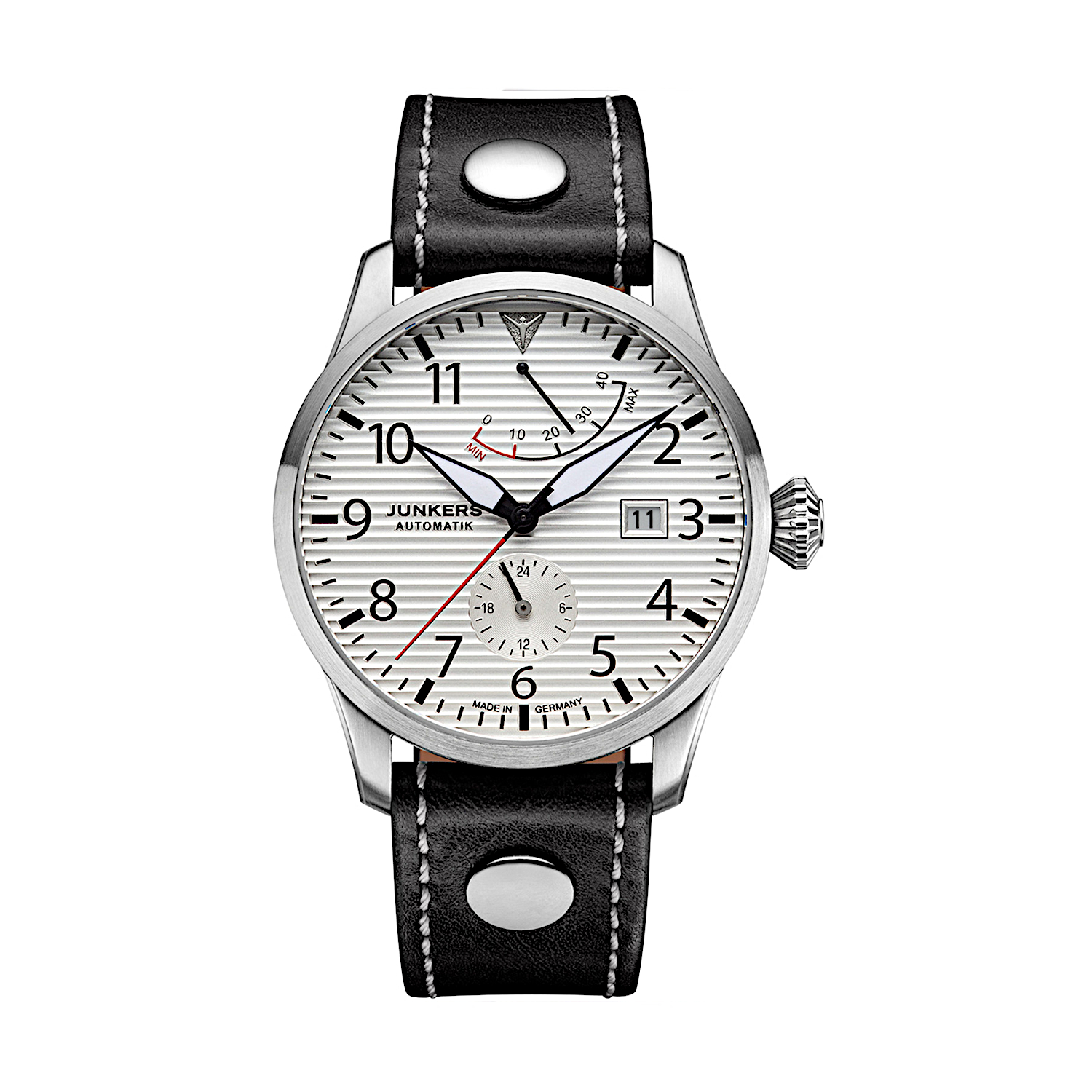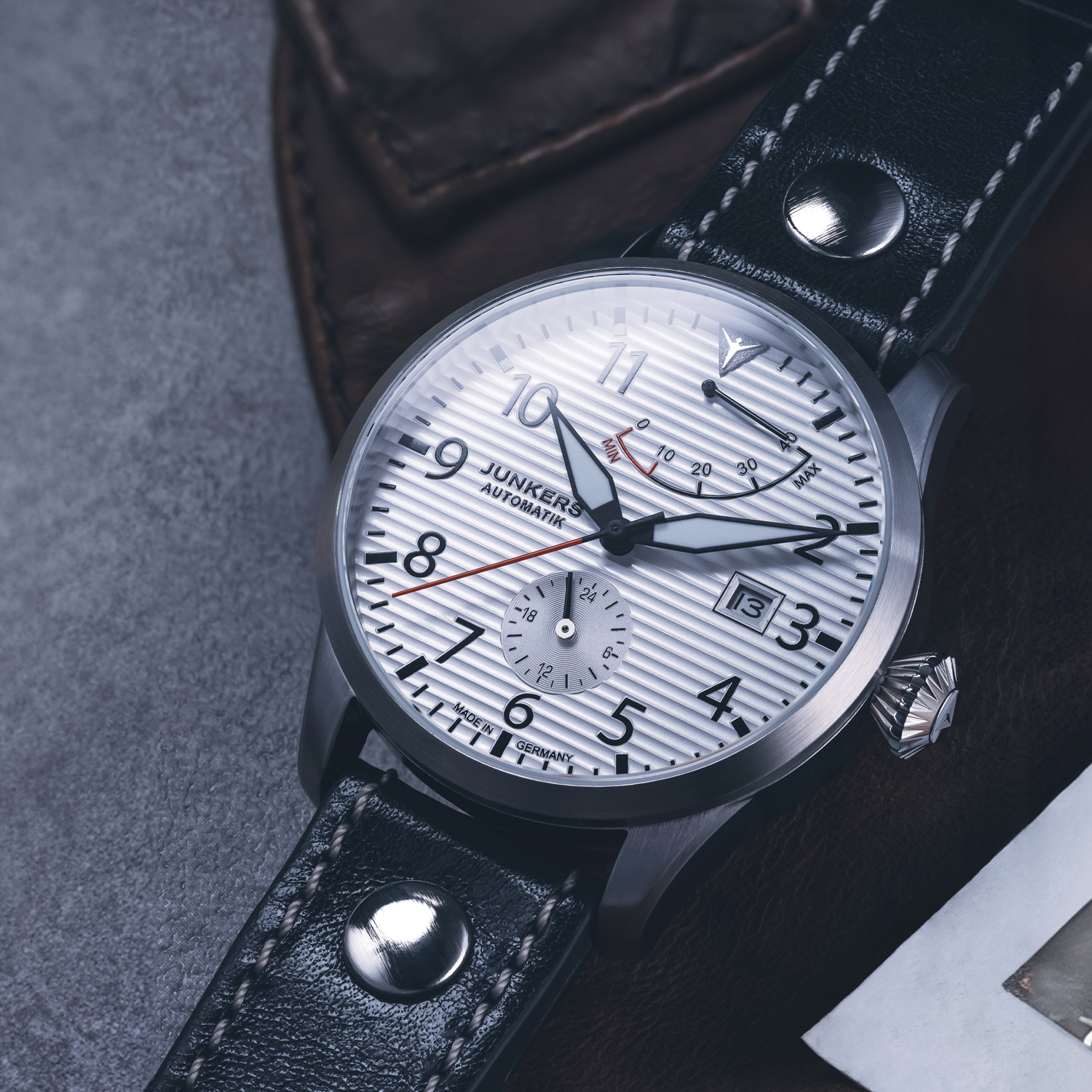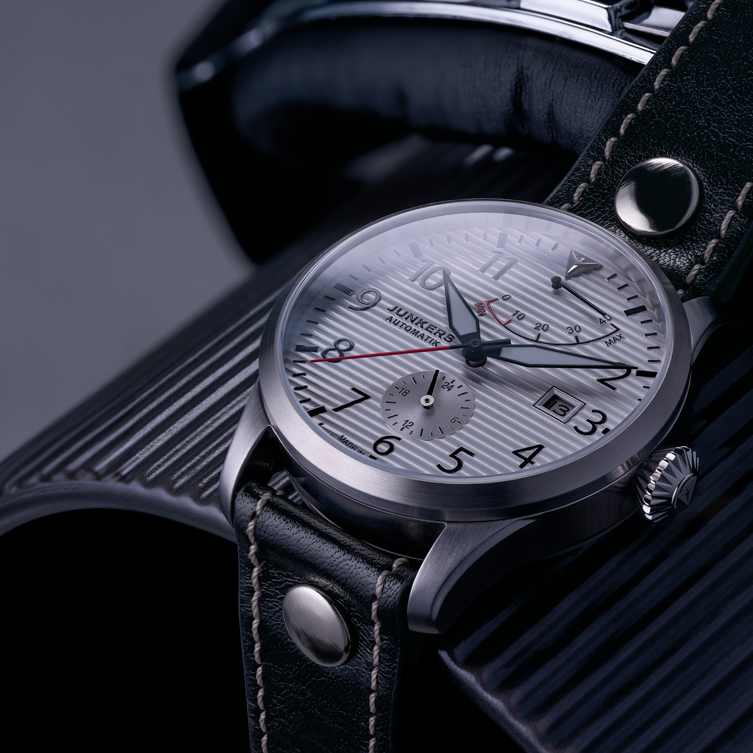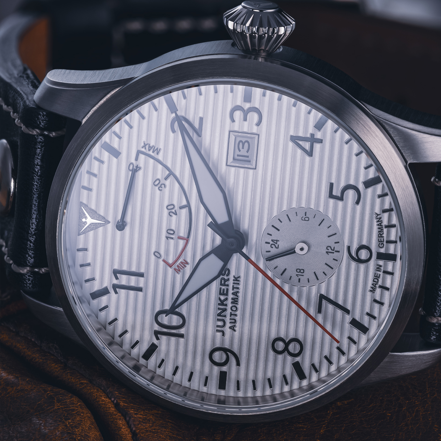 Die Junkers Flieger Automatik Gangreserve ist eine klassische Fliegeruhr, perfekt ablesbar, große, griffige Krone, zuverlässige, robuste Verarbeitung. Um immer im Bilde zu sein, wieviel Benzin die Uhr noch im Tank hat, wurde oben auf dem Zifferblatt zudem eine Gangreserveanzeige integriert, die sich auch gestalterisch perfekt in das Zifferblatt einfügt.