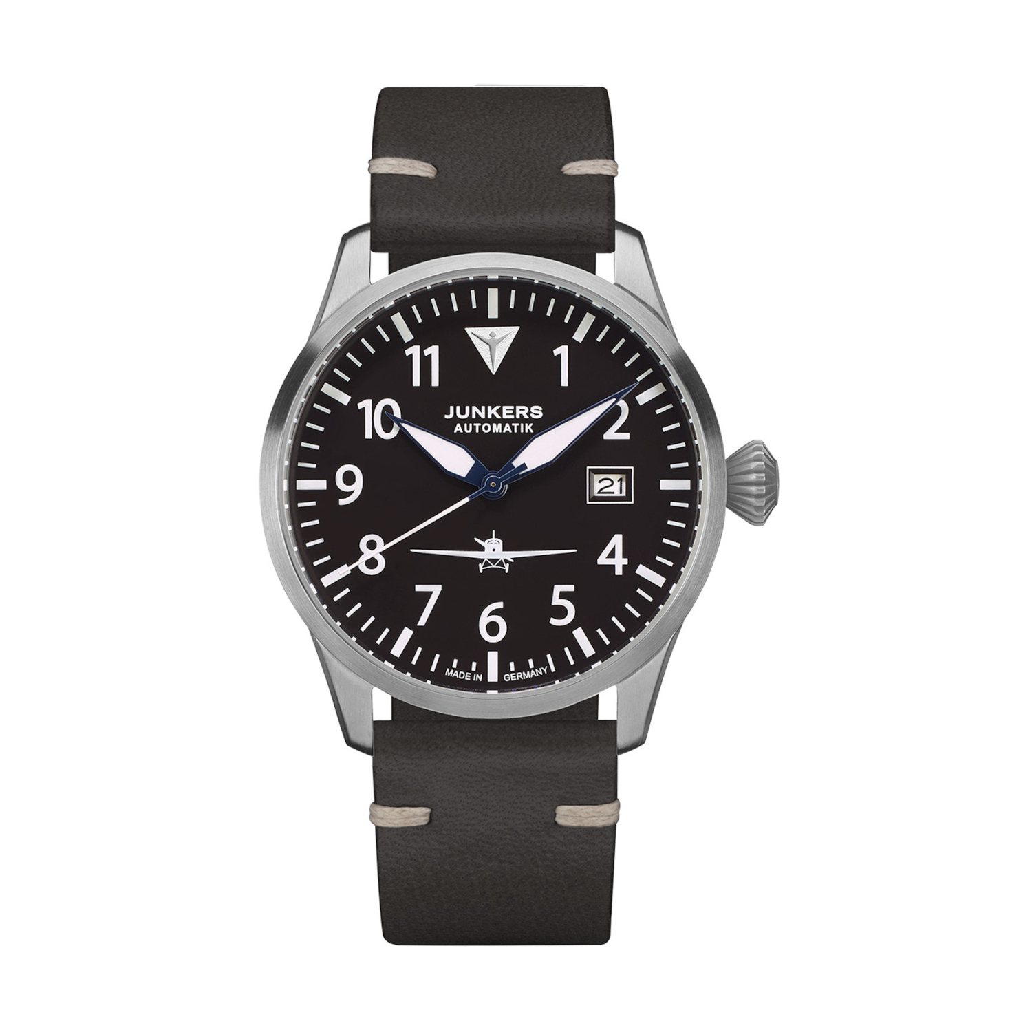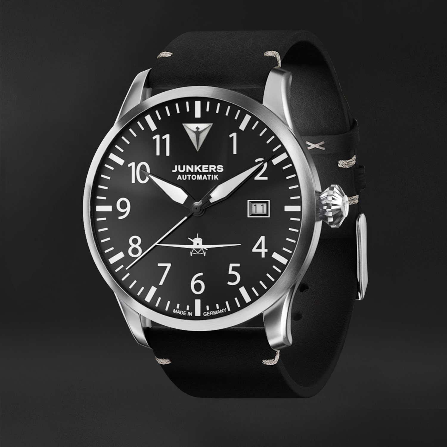 Die Junkers Flieger Automatik ist der Klassiker unter den Fliegeruhren. Hochwertige Verarbeitung für absolute Zuverlässigkeit, perfekte Ablesbarkeit mit großen, im Dunkeln leuchtenden Ziffern und Indizes, große Zwiebelkrone und das erste Passagierflugzeug der Welt auf dem Zifferblatt, die Junkers F13, die heute wieder gebaut wird und fliegt.