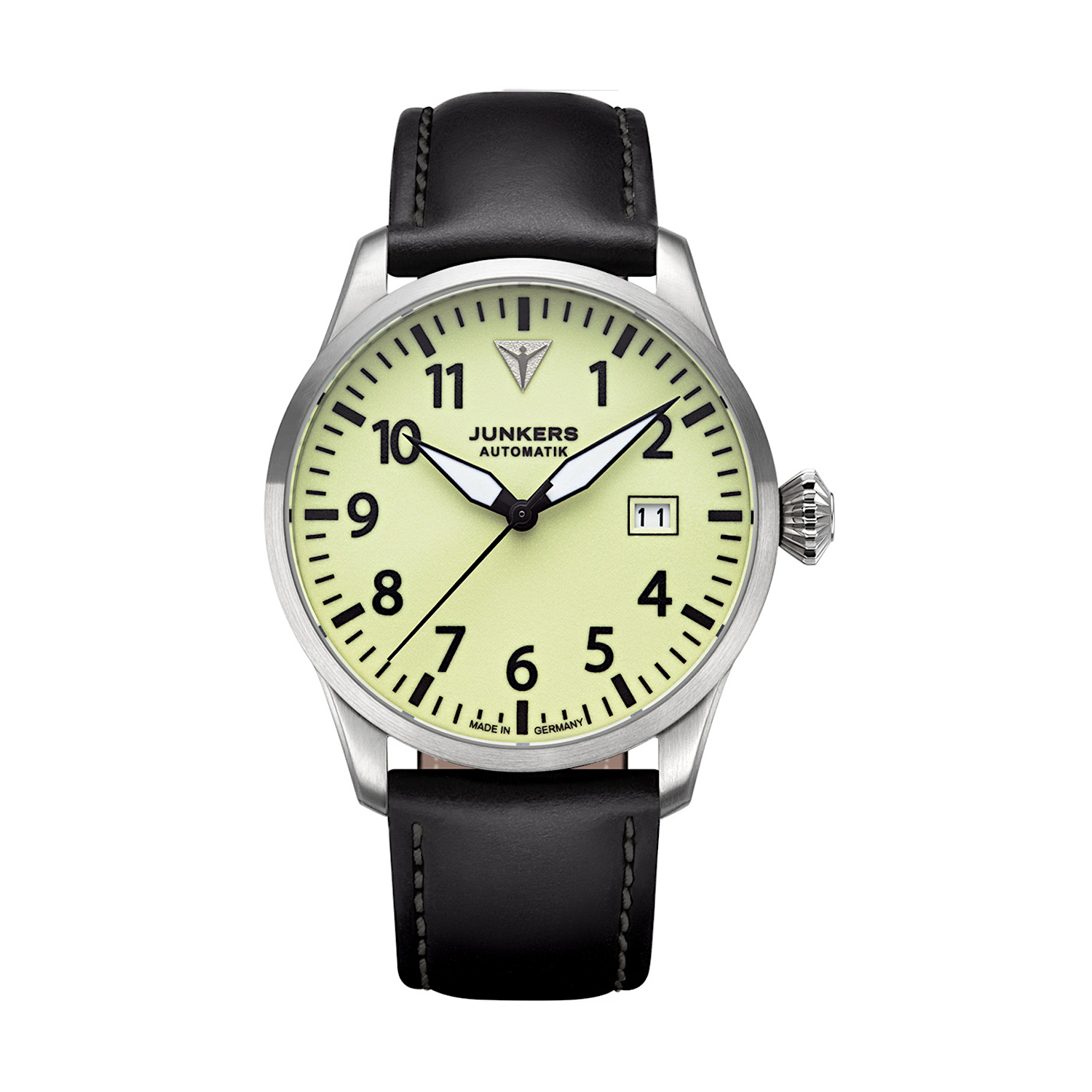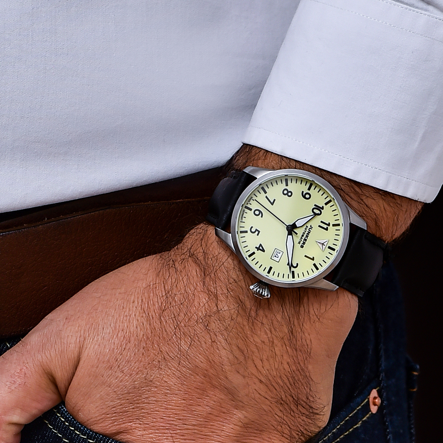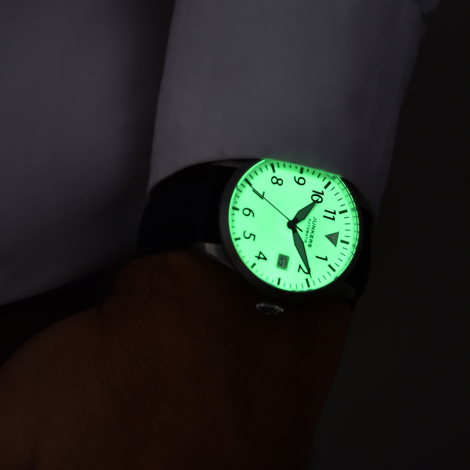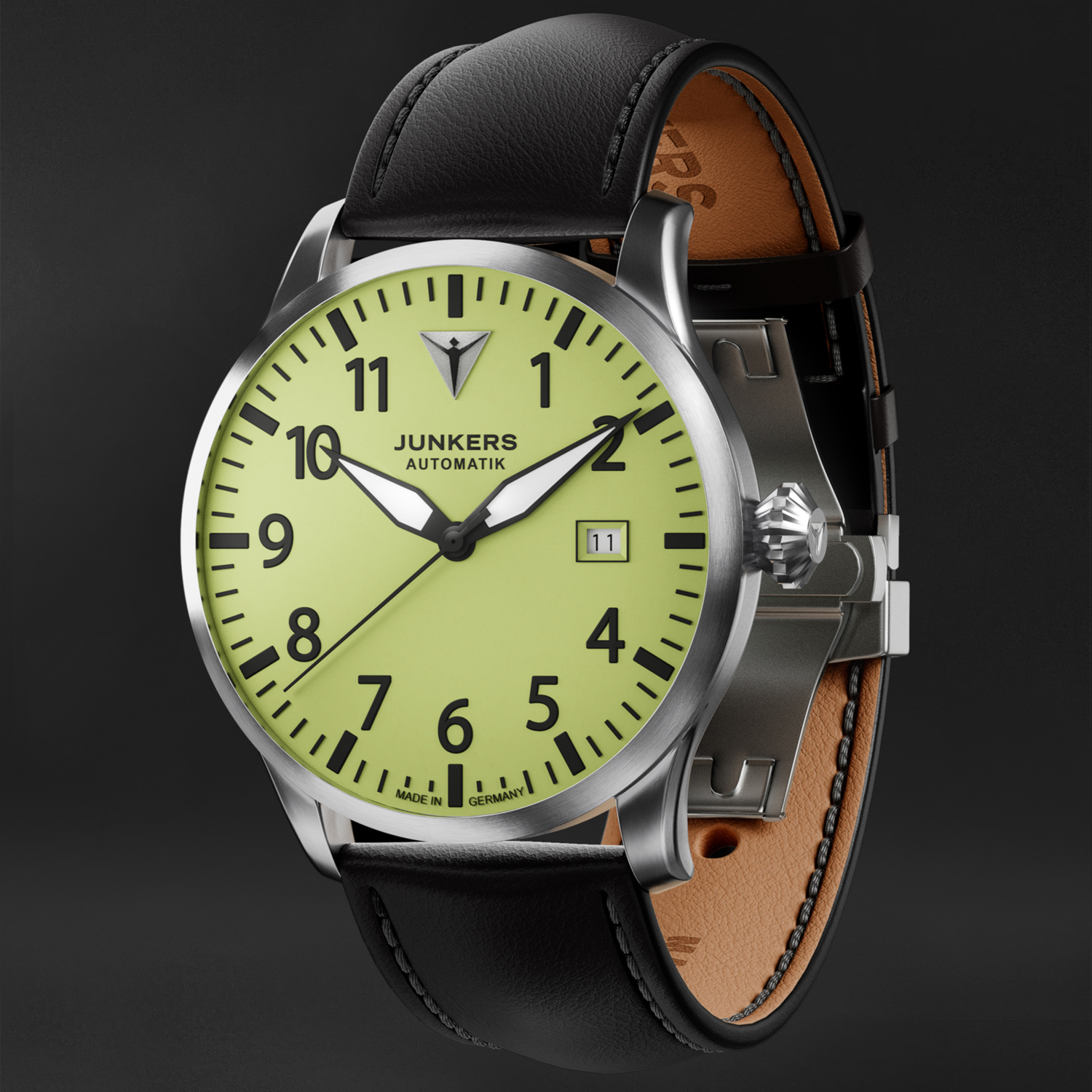 Die Junkers-Sonderedition '100 Jahre Nachtflug' zeigt sich mit einem vollständig fluoreszierenden Zifferblatt und ist auf 999 Exemplare limitiert. Diese außergewöhnliche Uhr zelebriert den historischen Meilenstein des ersten Nachtflugs in einer Junkers-Maschine von New York nach Chicago, ein bahnbrechendes Ereignis in den frühen Jahren der Luftfahrt.