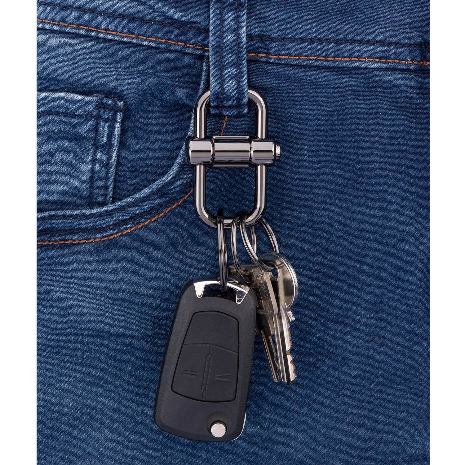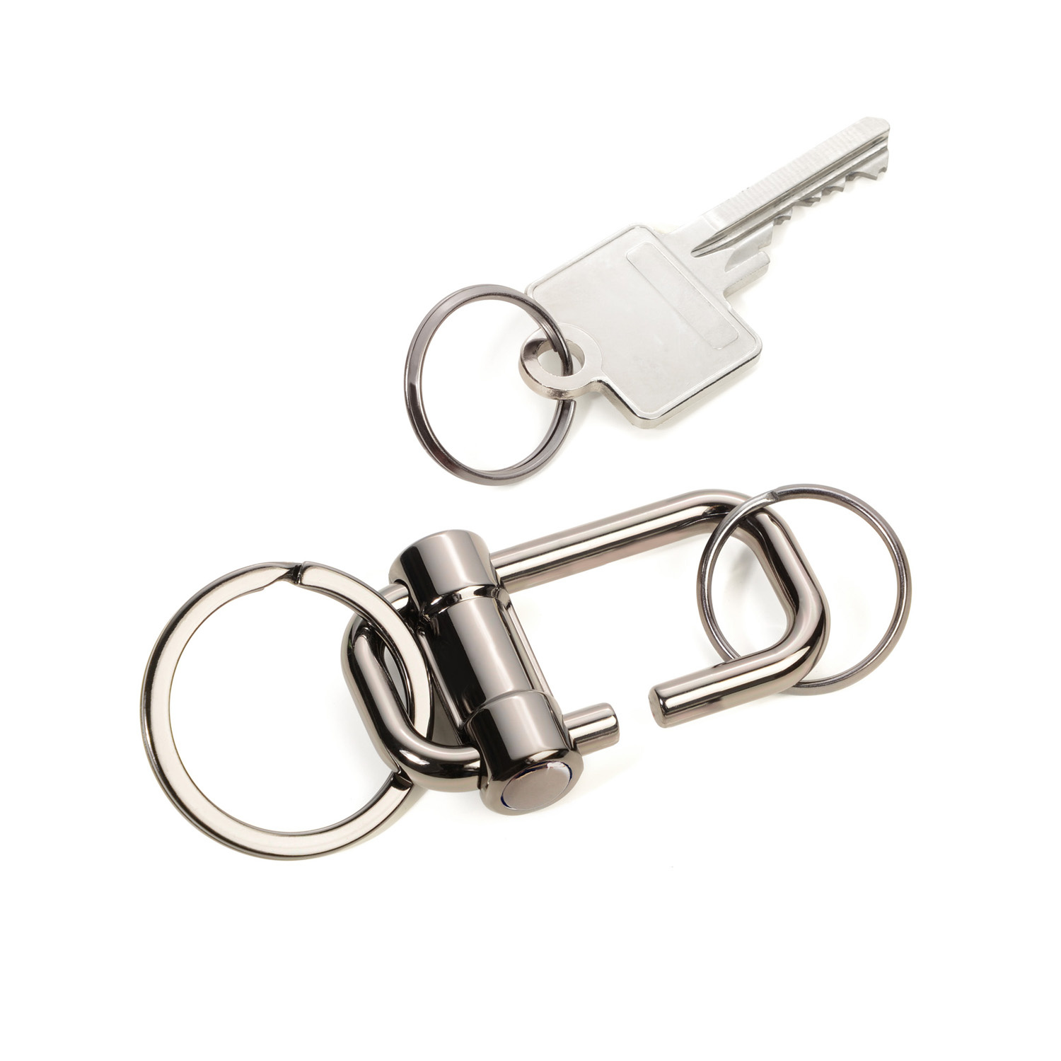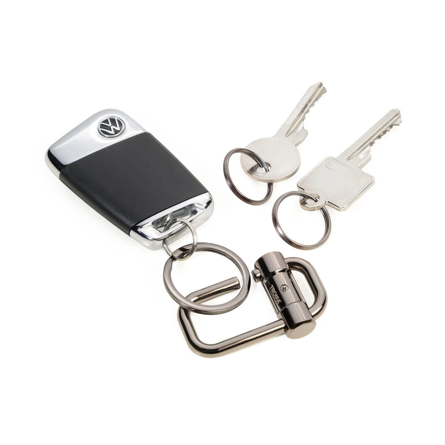 Coole Technik für alle, die öfter mal die Schlüssel wechseln. Einfach per Knopfdruck die Verriegelung lösen, und der Metallbolzen gleitet geschmeidig nach links oder rechts und gibt die Schlüsselringe frei.