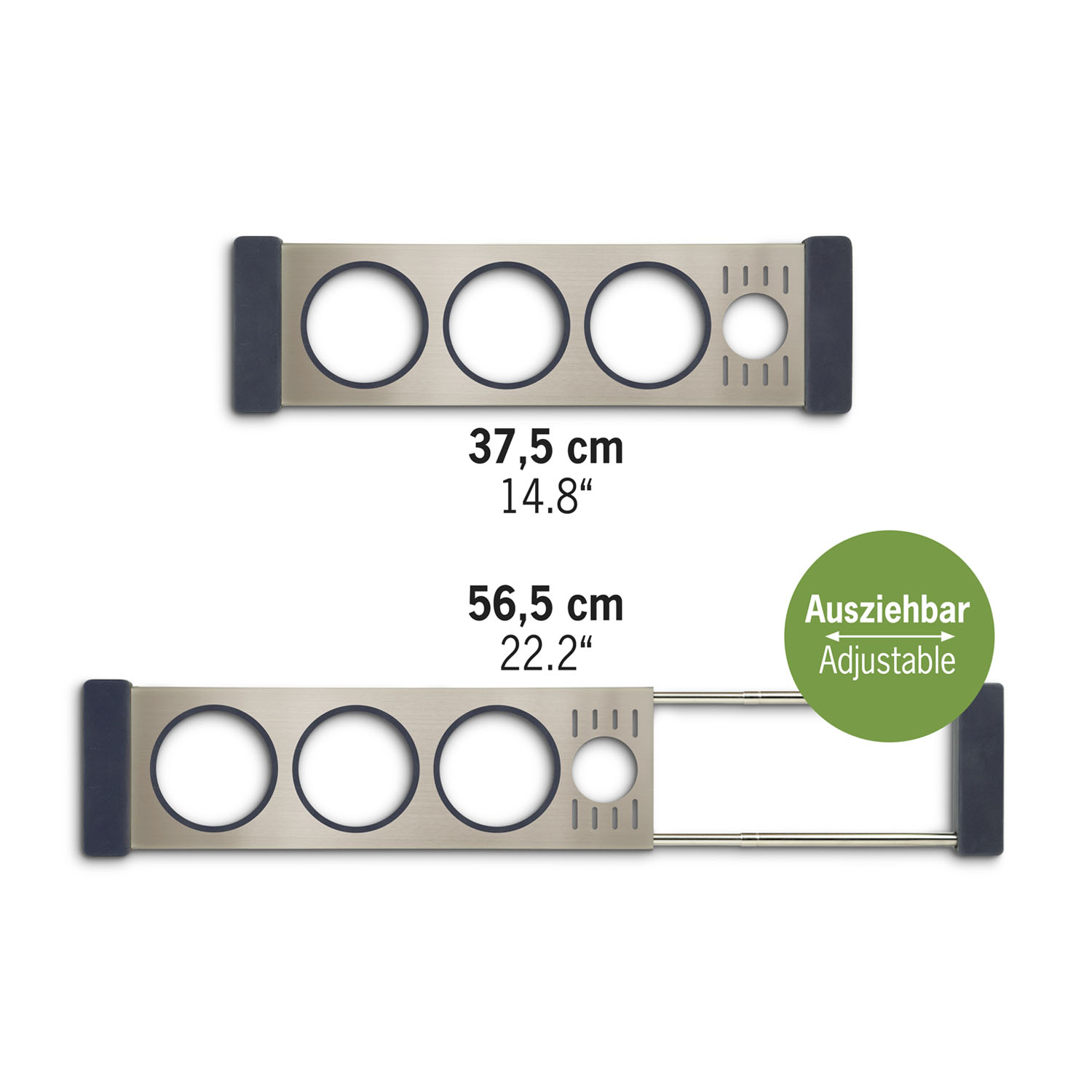 Drip.it+ ist ausziehbar von 37,5 bis 56,5 cm und passt somit perfekt auf jede Spüle. Damit kann er auch ideal als flexible Siebhalterung zum Abtropfen von gewaschenen oder gekochten Lebensmitteln über der Spüle genutzt werden.