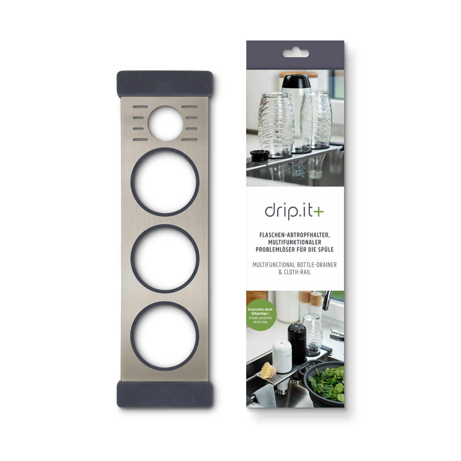 Passend für fast alle Flaschen, auch die Trinkflaschen der gängigen Soda-Macher und deren Verschlüsse. Zudem eignet sich drip.it+ auch perfekt zum Trocknen von Lappen, Bürsten und Co.