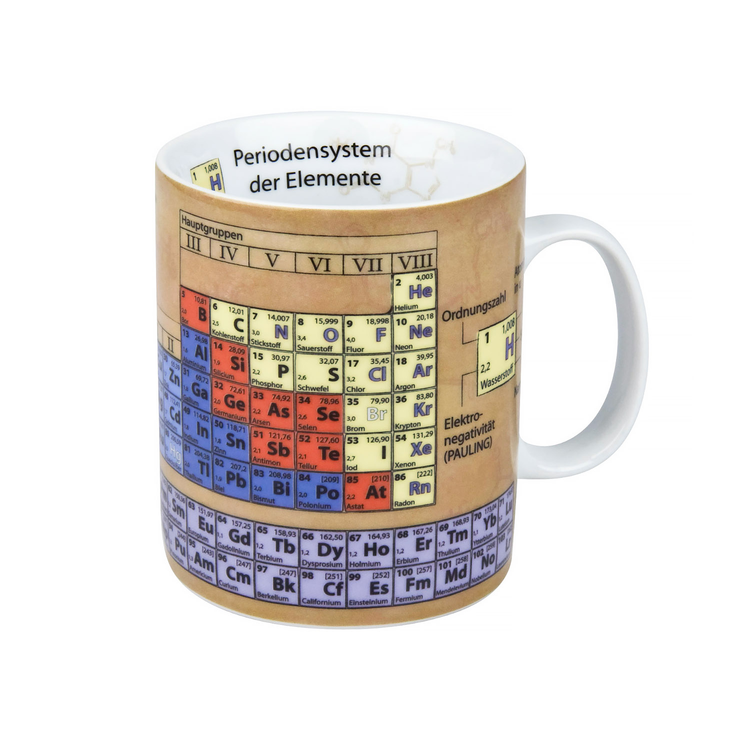 Platz im Periodensystem der Elemente. Eine Komplettübersicht der Haupt- und Nebengruppen des Systems entdeckst du auf dem schönen Kaffebecher Chemie von KÖNITZ Porzellan. Das perfekte Geschenk für
