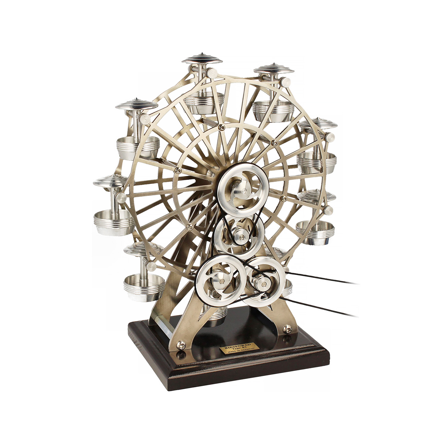 Das 1897 errichtete Riesenrad des Wiener Prater ist eines der Wahrzeichen der österreichischen Hauptstadt. Dieses filigrane, zu den Böhm-Stirlingmotoren passende Modell erinnert an den Glanz vergangener Zeiten.