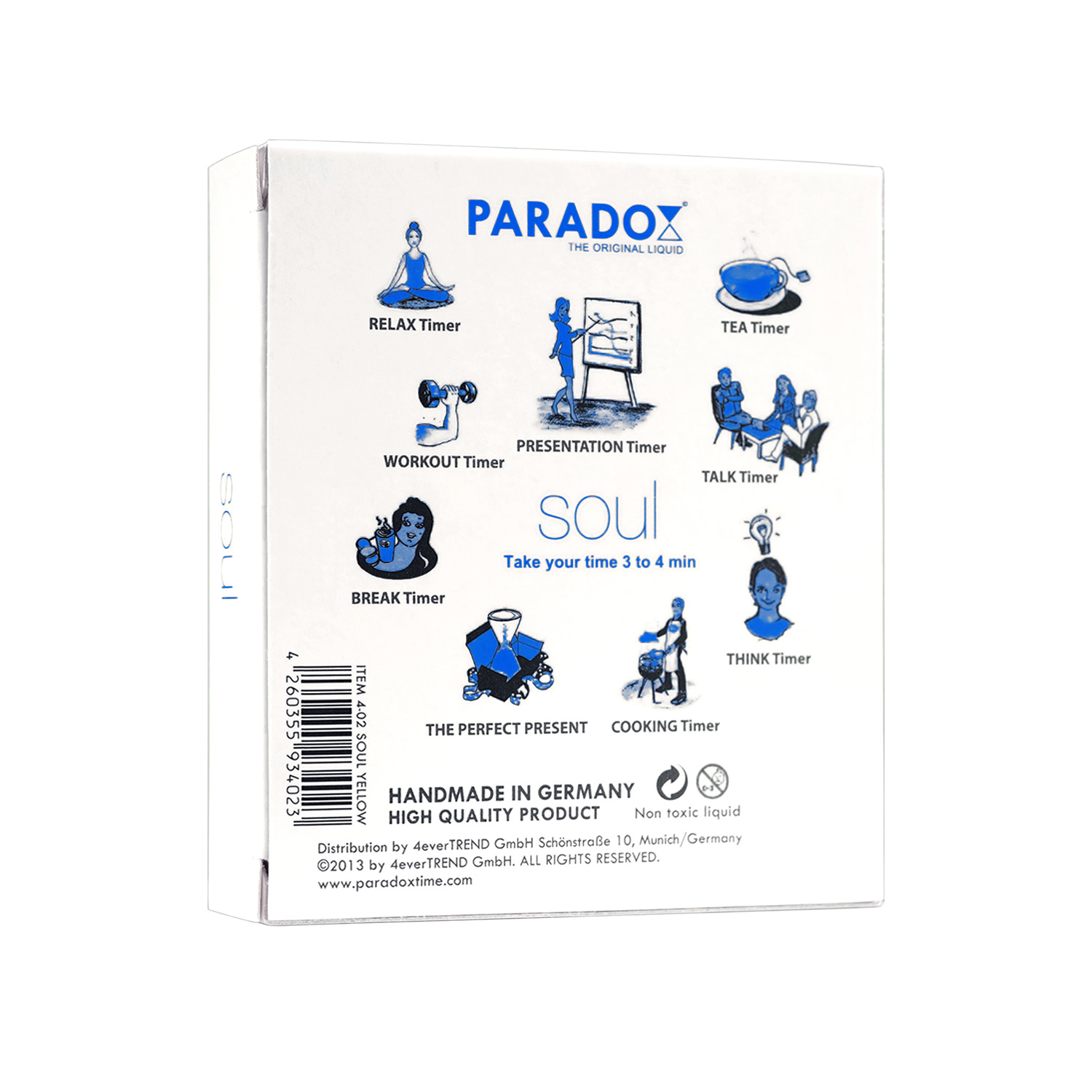 ... aus vollem Herzen und mit ganzer Seele. Lassen Sie sich mit Paradox Soul an die kleinen Augenblicke erinnern, die oft doch so wichtig sind. Timen Sie Ihre Momente für die Seele, eine Espressopause, eine kurze Musikpause, eine Denkpause oder Stretchingpause im Büro oder auch einfach nur die tägliche Zeit fürs Zähneputzen.
