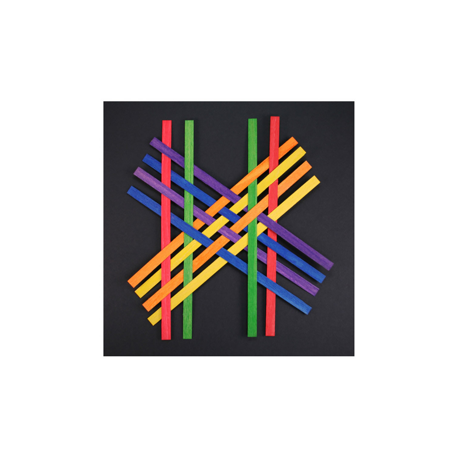 Inhalt: 120 Holzspäne in 6 Farben, 25 cm lang, 1 cm breit, 1 mm stark, 4 farbige Kartons.