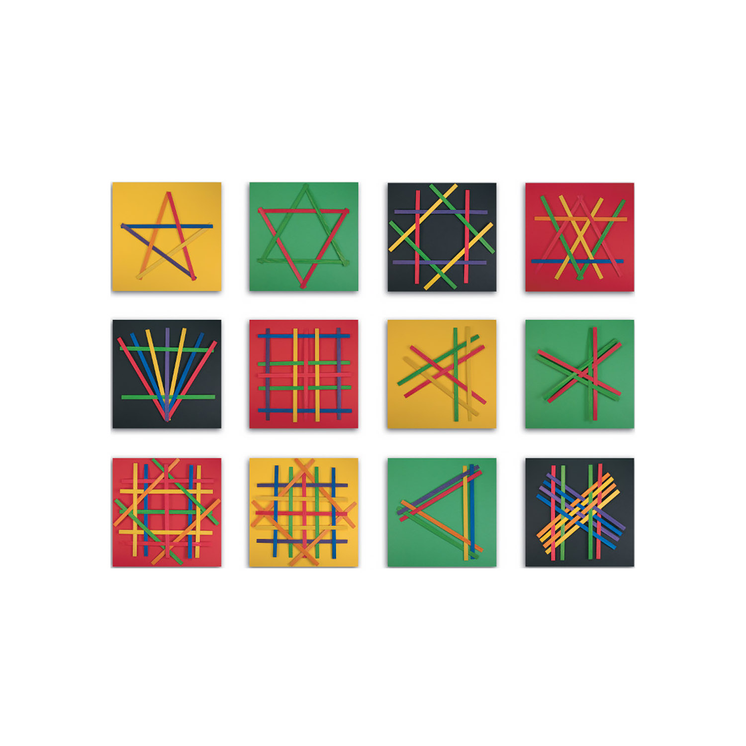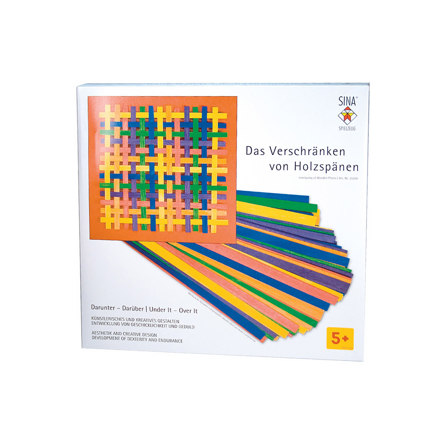 Es handelt sich nach Friedrich Fröbel um ein "Spiel mit Linien", bei dem Holzspäne in den Farben des Regenbogens zu flächigen Mustern zusammengefügt werden. Die beiliegenden farbigen Kartons als Hintergrund für gestaltete Motive sind harmonisch auf die Farben der Holzspäne abgestimmt.
