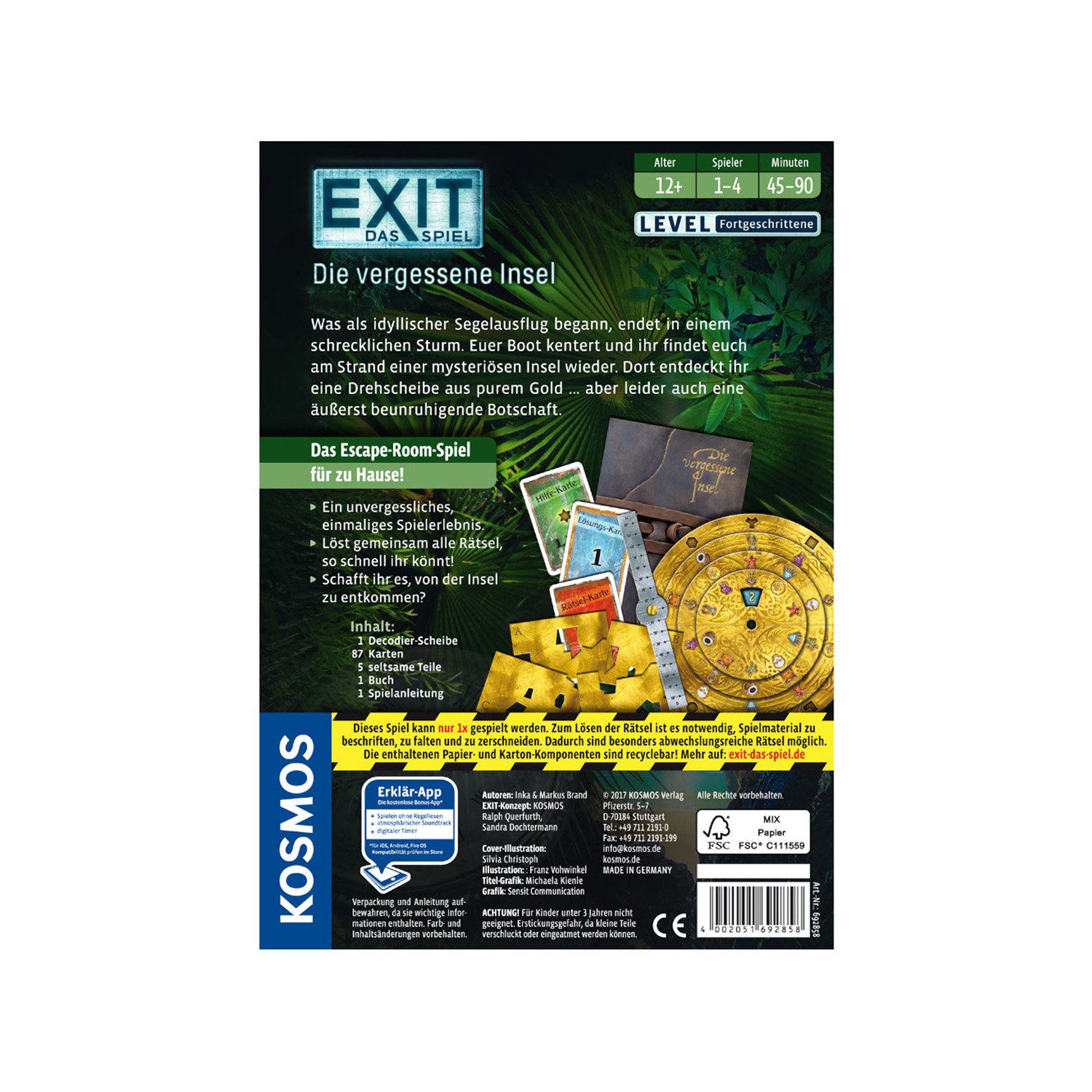 Ein Segelausflug im Pazifik endet in einem Sturm. Das Boot kentert und die Spieler stranden auf einer scheinbar einsamen Insel. Doch offenbar sind sie nicht die Ersten auf dieser Insel. Am Strand finden sie ein angekettetes Boot. Ein Unbekannter hat die ganze Insel mit Rätseln versehen. Wird das Team sie alle lösen, das Boot losmachen und entkommen? Bei „EXIT – Das Spiel“ entdecken die Spieler mit etwas Kombinationsgabe, Teamgeist und Kreativität nach und nach immer mehr Gegenstände, knacken Codes, lösen Rätsel und kommen der Freiheit Stück für Stück näher. Dabei müssen auch ungewöhnliche Wege beschritten werden. So darf das Material geknickt, beschriftet oder zerrissen werden. Ist das Geheimnis der Insel einmal gelüftet, kann das Event-Spiel kein zweites Mal gespielt werden. Das macht den Spieleabend zu einem besonderen Highlight. Live-Escape-Feeling im Fortgeschrittenen-Level.