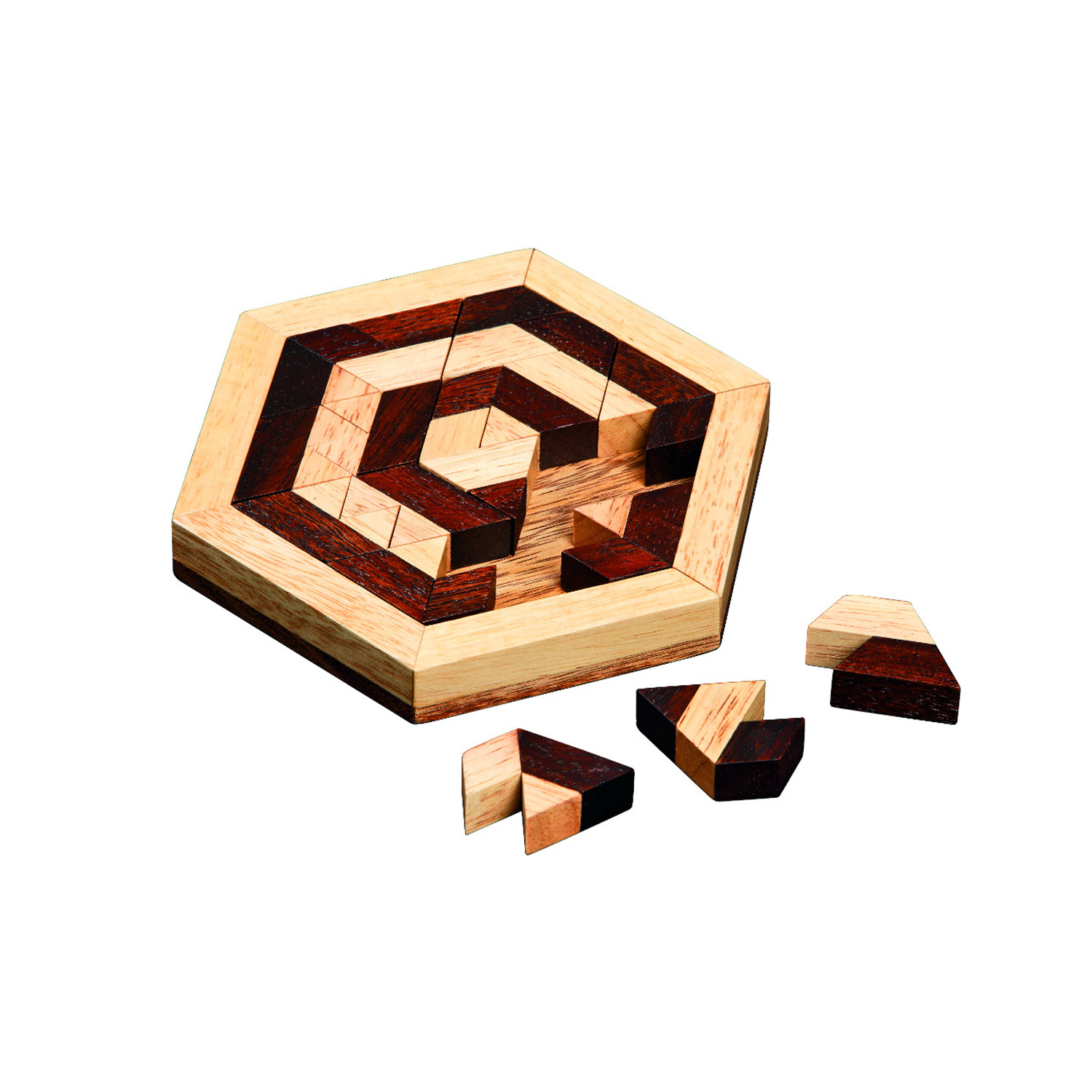 Ziel ist es, die 16 formgleichen Puzzleteile mit 7 unterschiedlichen Mustern in vorgegebener Form in den Rahmen zu legen.