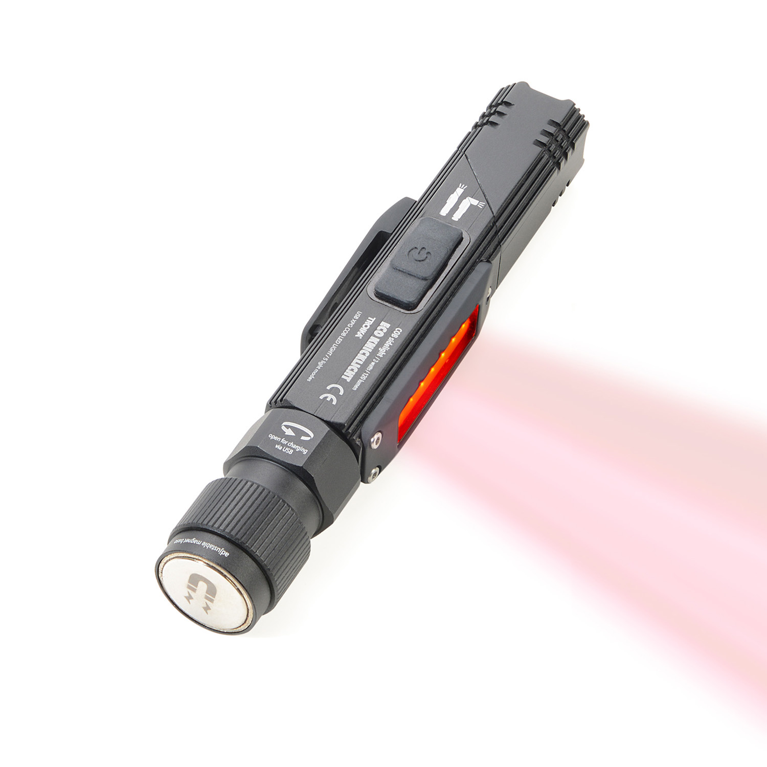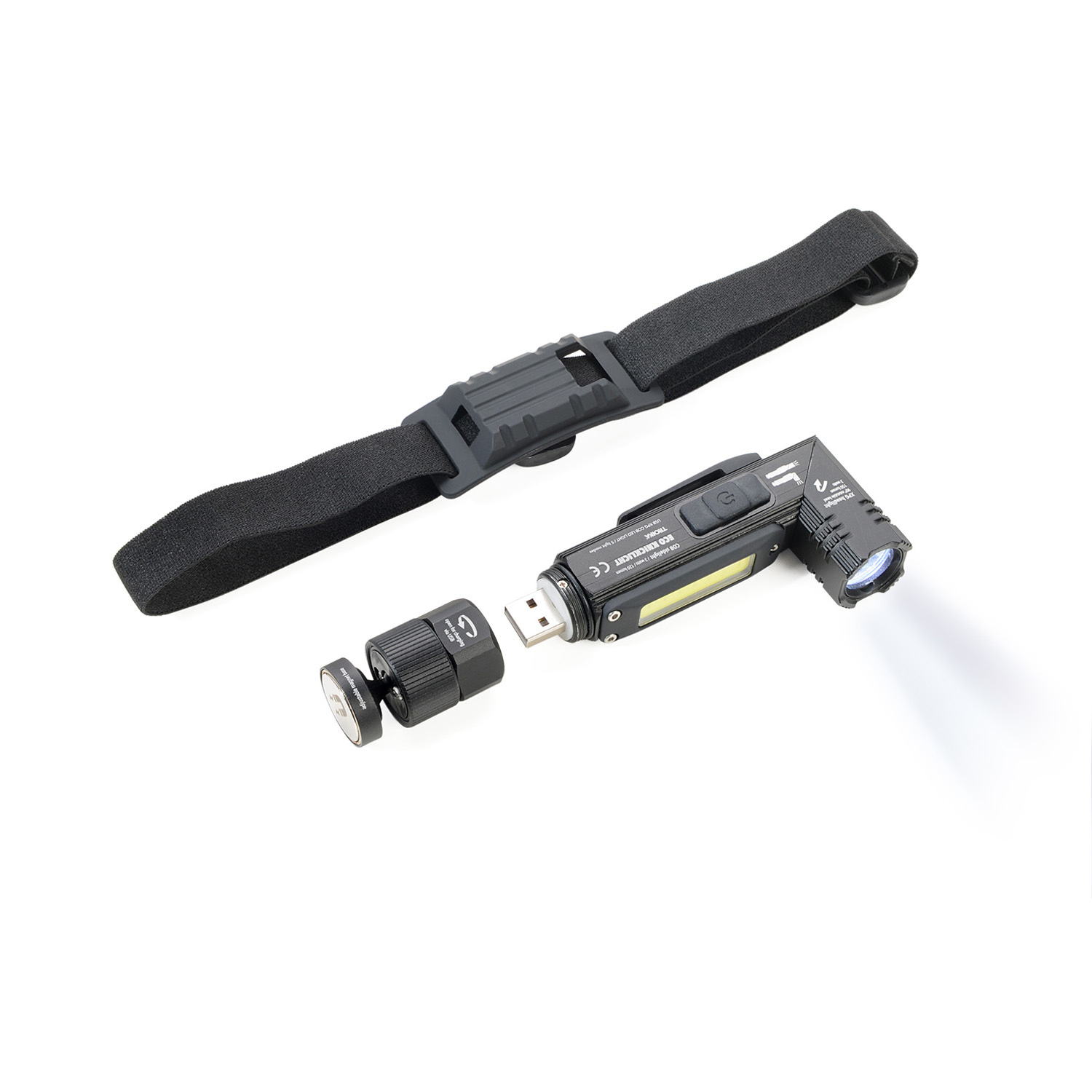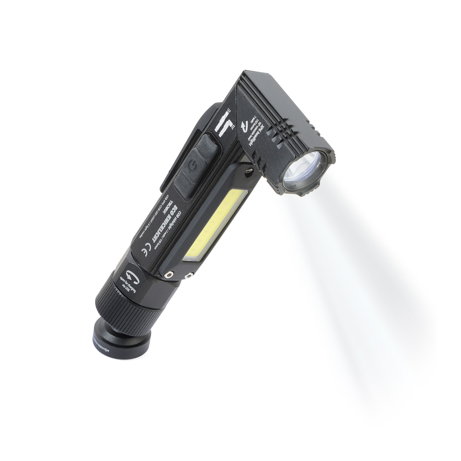 Der Leuchtknopf ist zum optimalen Ausleuchten bis zu 90° abknickbar. Die seitlichen COB-LEDs schaffen 120 Lumen in Weiß als Arbeitslicht oder Rot als Warnleuchte – Schnellblinkfunktion inklusive.