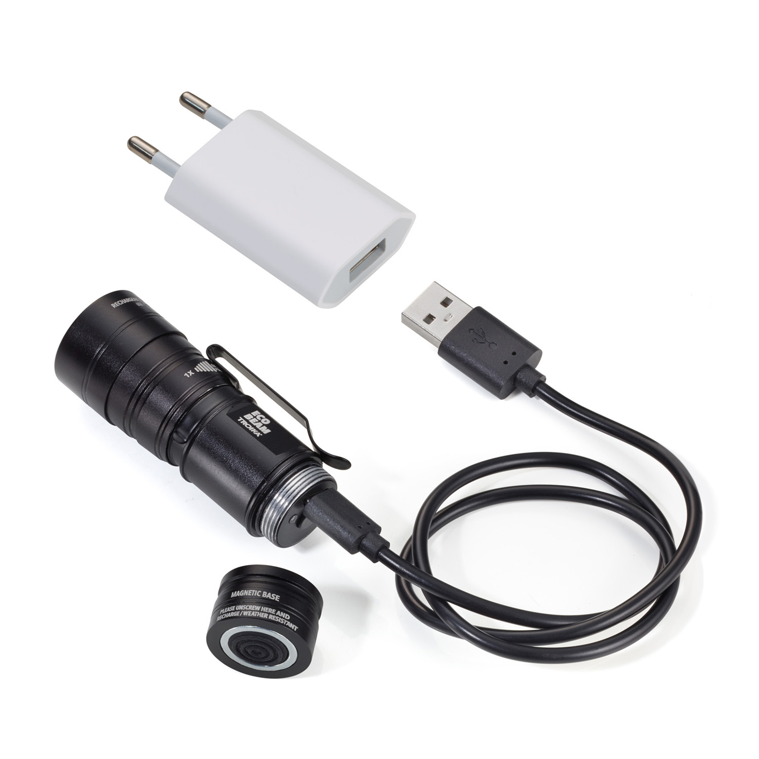 - LED-Taschenlampe, weißes Licht, 3 Leuchtfunktionen: 2 Lichtstärken, Blinklicht, 6-fach Zoom, mit Magnetfunktion, aufladbar – ECO friendly