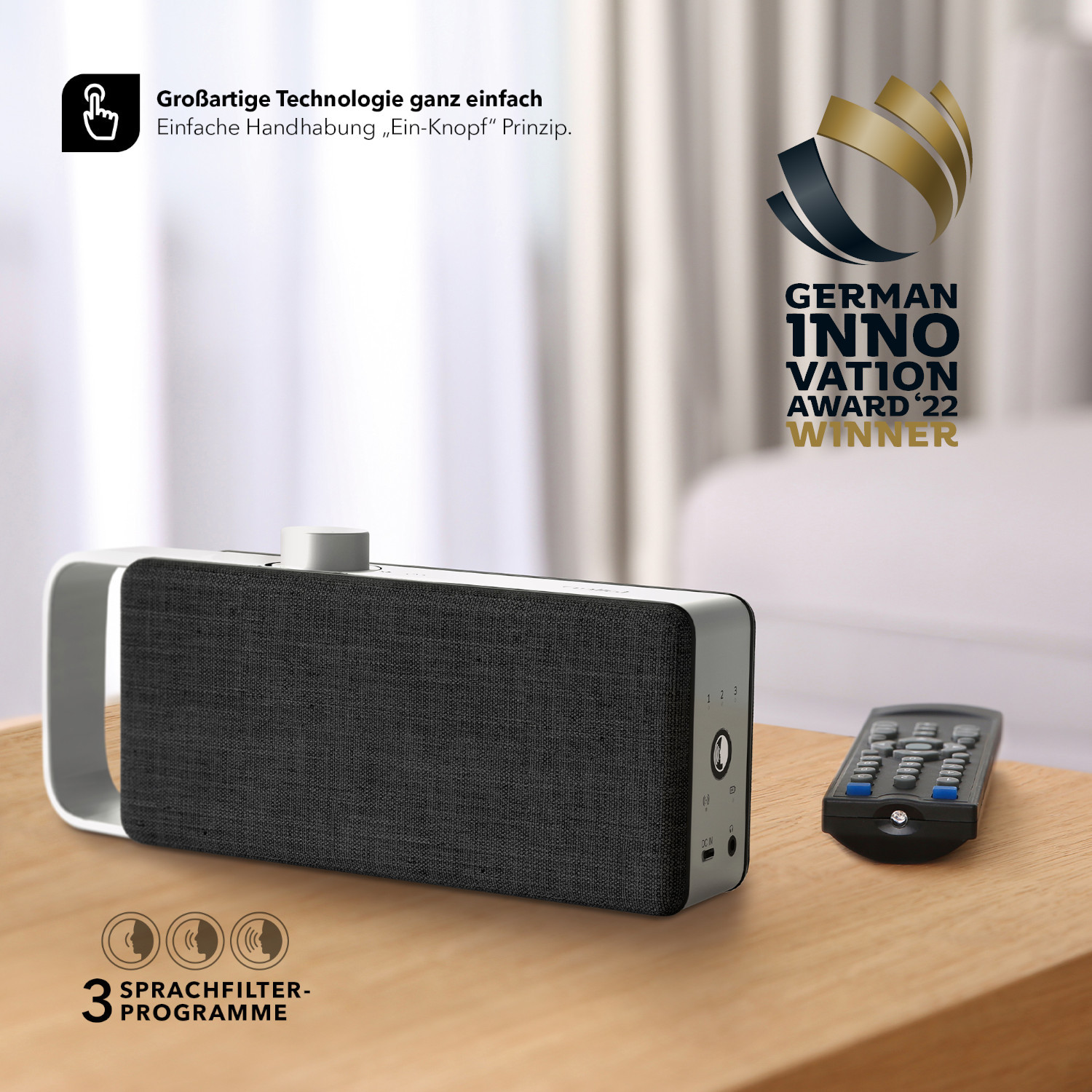 OSKAR vereint eine einzigartige Technologie zur Dialogoptimierung in einem kompaktem Design. Zwei Breitband Lautsprecher und ein Passivtreiber sorgen für besten Klang und eine klare Sprachwiedergabe. Wählen Sie aus drei verschiedenen Sprachfiltereinstellungen ihren persönlichen Wohlklang und verpassen Sie keine Dialoge mehr, weil Soundeffekte oder Musik die Sprache überlagern. Ein intelligenter Algorithmus gewährleistet die kontinuierliche dynamische Anpassung des Fernsehtons an die individuelle Auswahl auch bei wechselnden Pegeln der Signalquelle und verbessert so den Sound Ihres TV-Geräts.