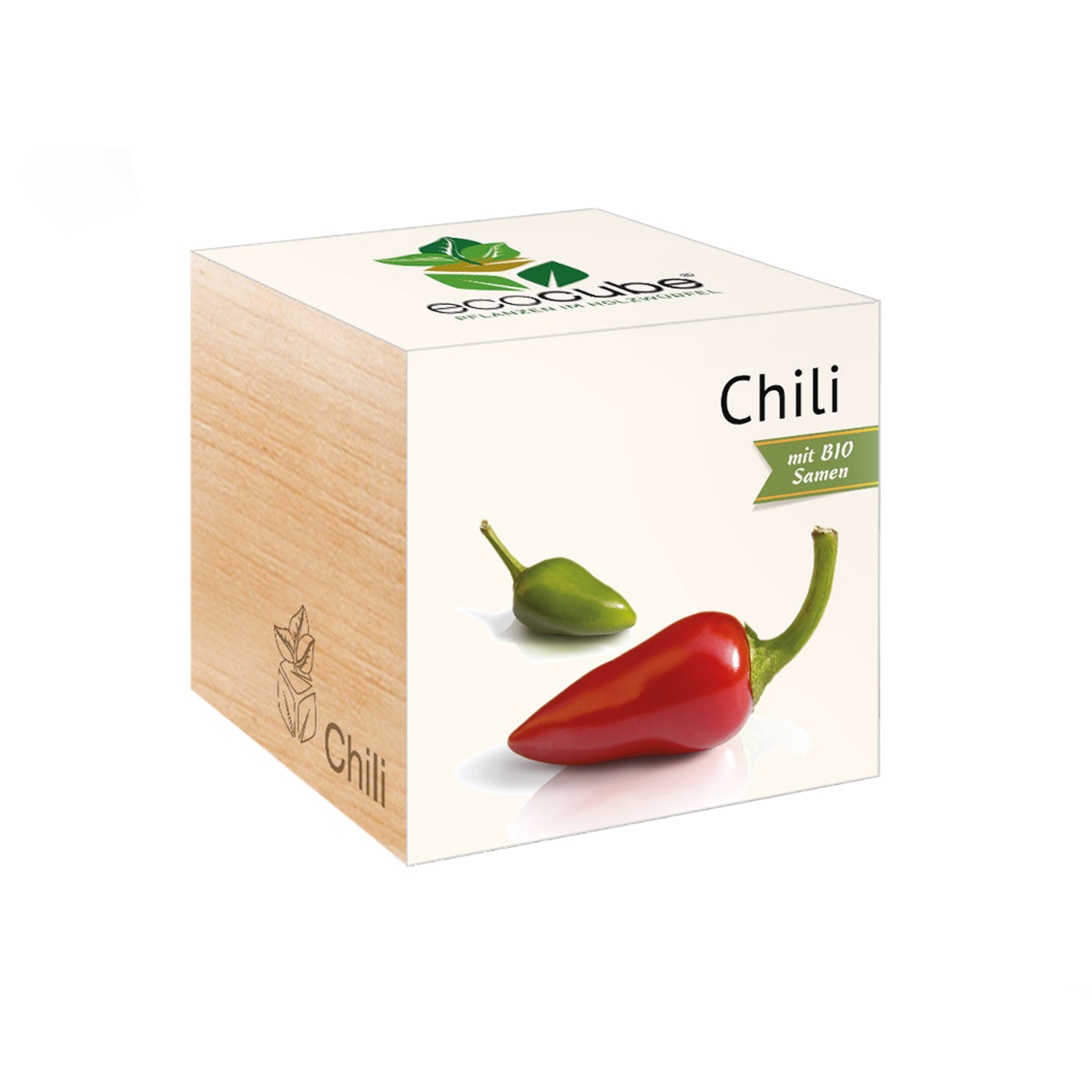 Mit dem einzigartigen "Ready to Grow" Konzept der Feel Green GmbH verwandelt sich der dekorative Holzwürfel in eine Chili Pflanze. Der verarbeitete Samen "Capela" ist ein aromatischer, scharfer Pfefferoni mit ca. 10 cm großen roten Chilischoten.