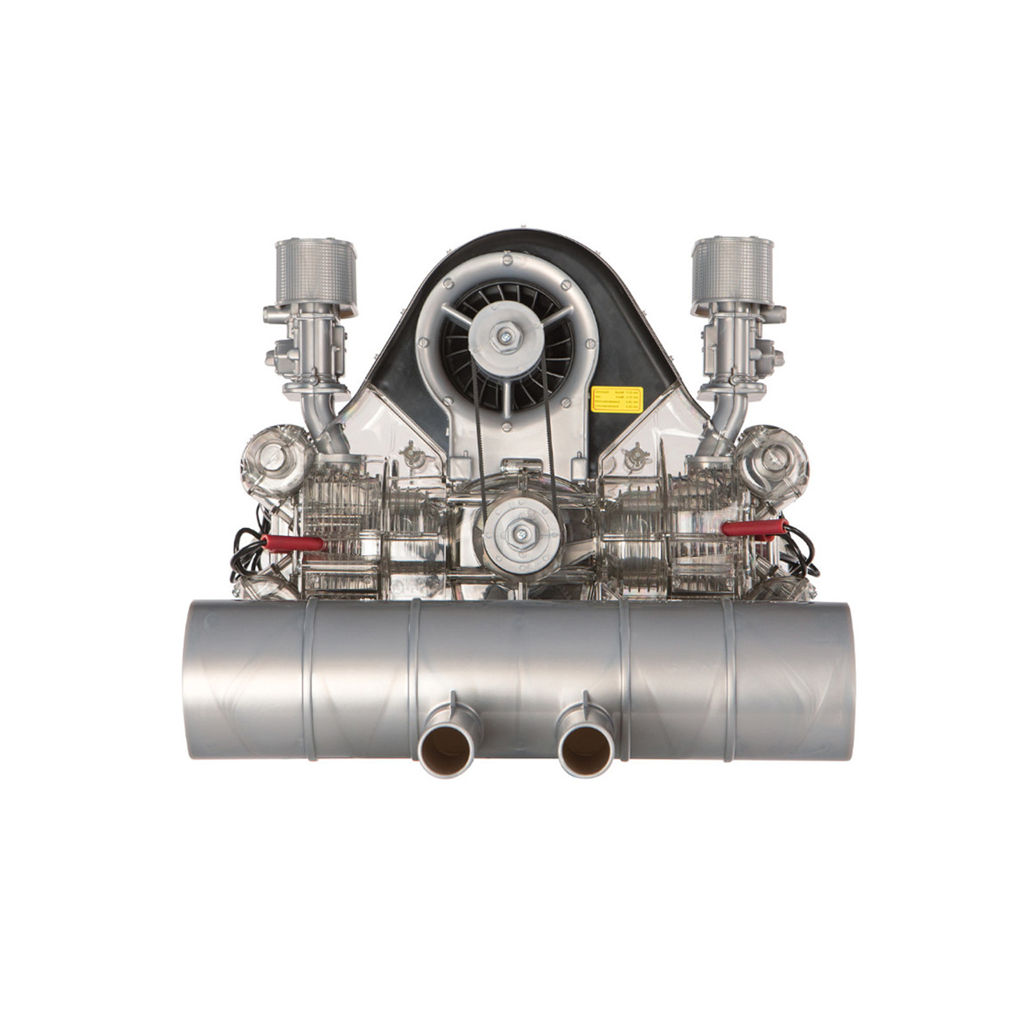 Die Königswellen, Kolben und Ventile bewegen sich im realgetreuen Zusammenspiel. Sogar die Zündfunken in den Zylindern werden durch LEDs simuliert. Die durchsichtigen Gehäuseteile lassen die Mechanik des Motors und den Motorenaufbau von außen sichtbar und begreifbar werden.